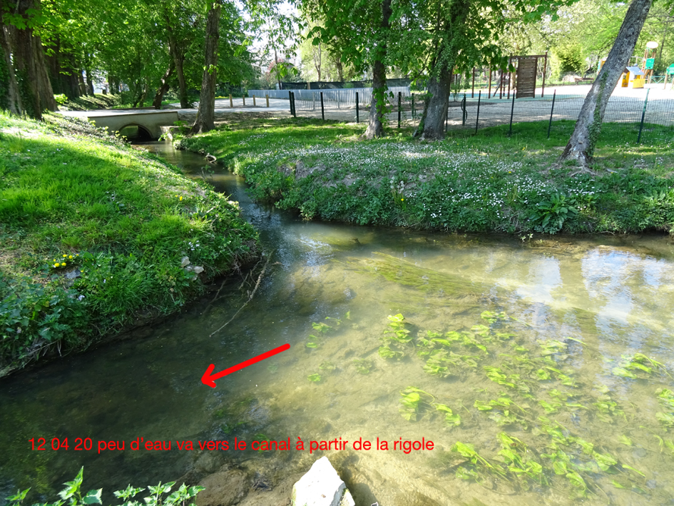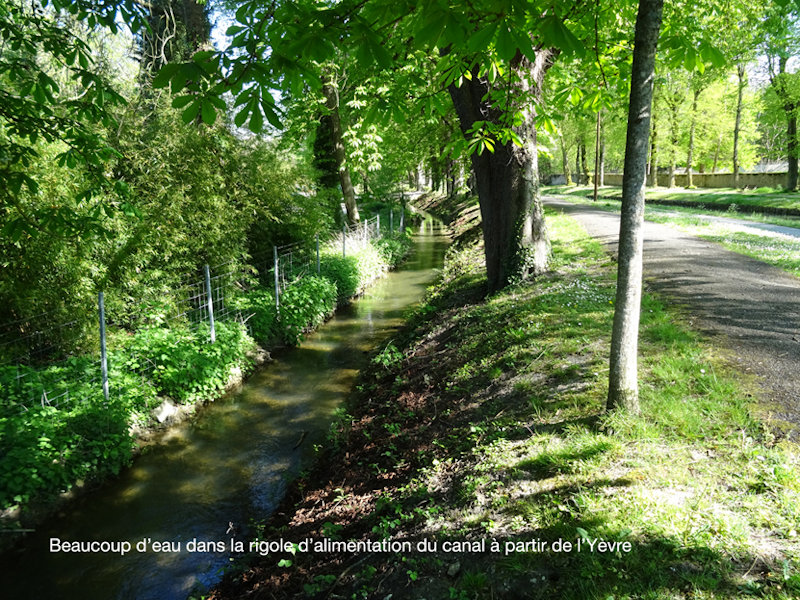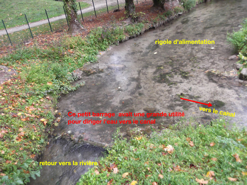 Vous remarquez beaucoup d’eau dans la rigole d’alimentation………. mais plus trace du petit barrage qui permettait à l’eau de s’engager dans le canal……. il a été retiré !!!!!!! peut-être pour aider les antis-canaux.